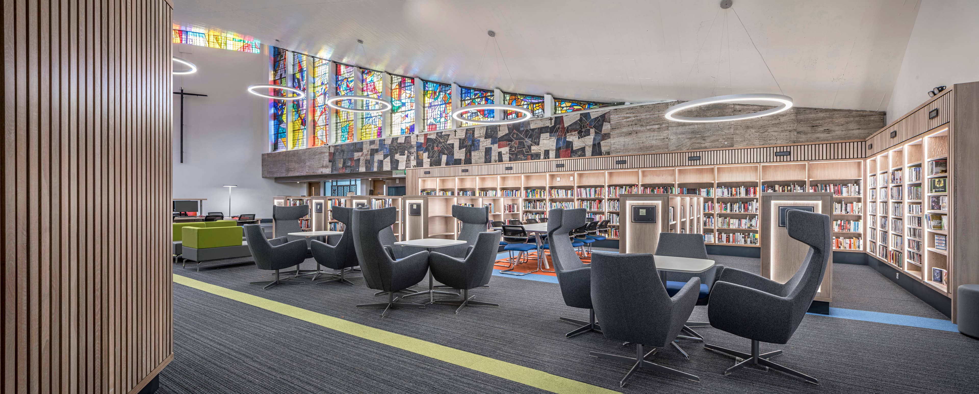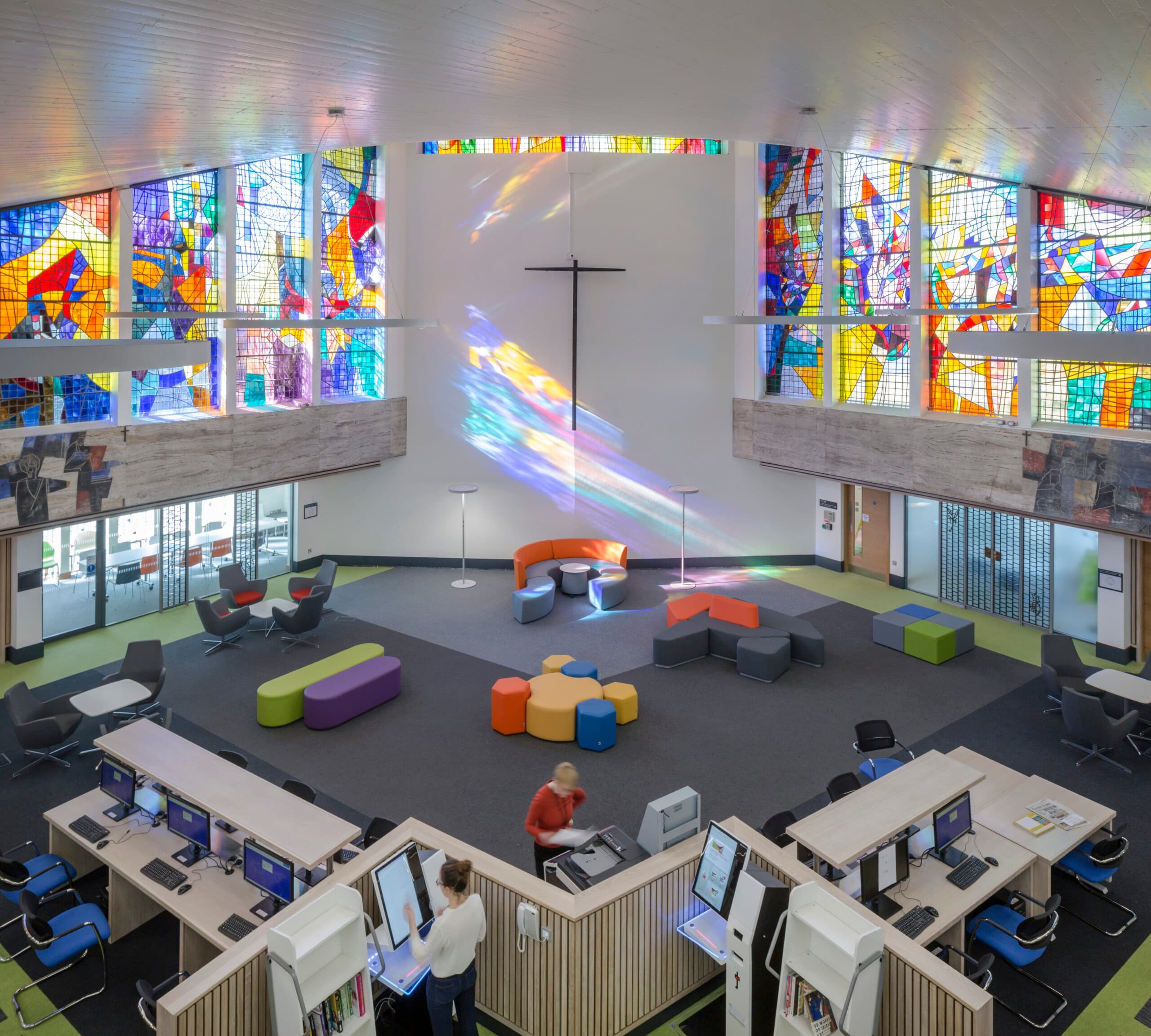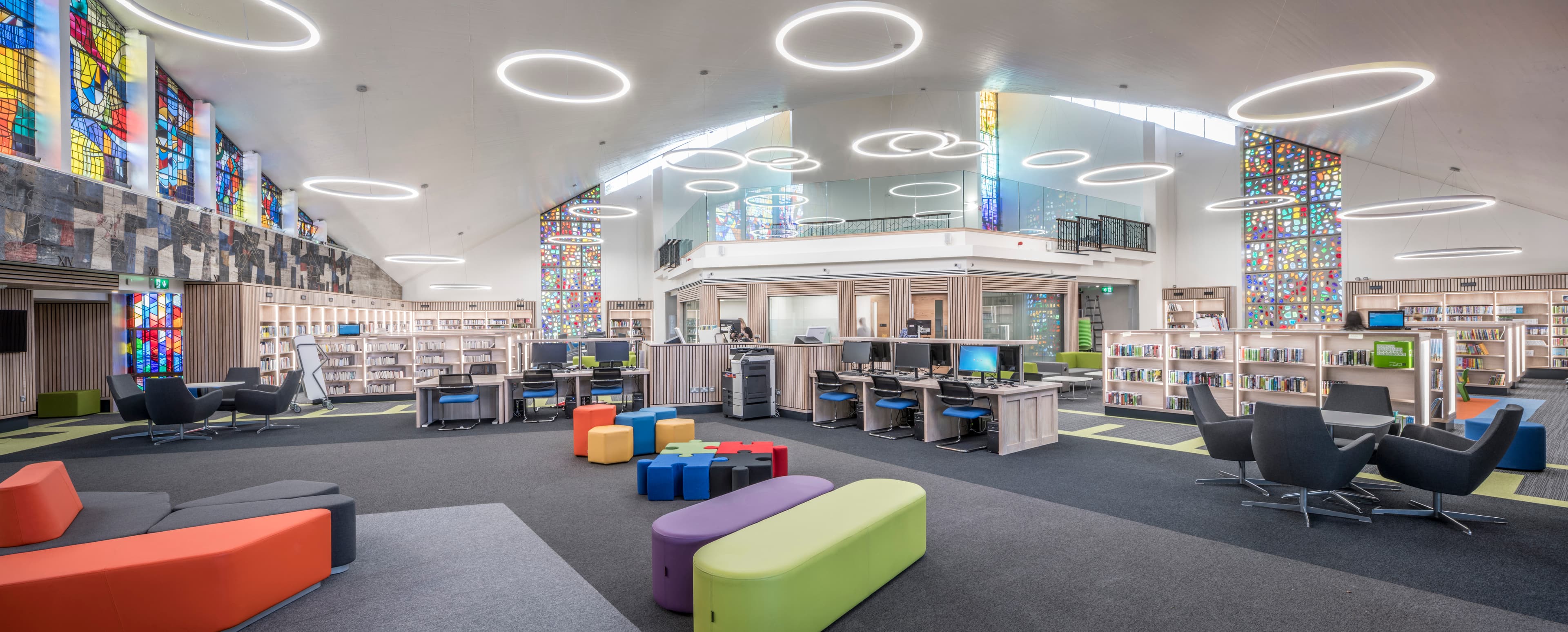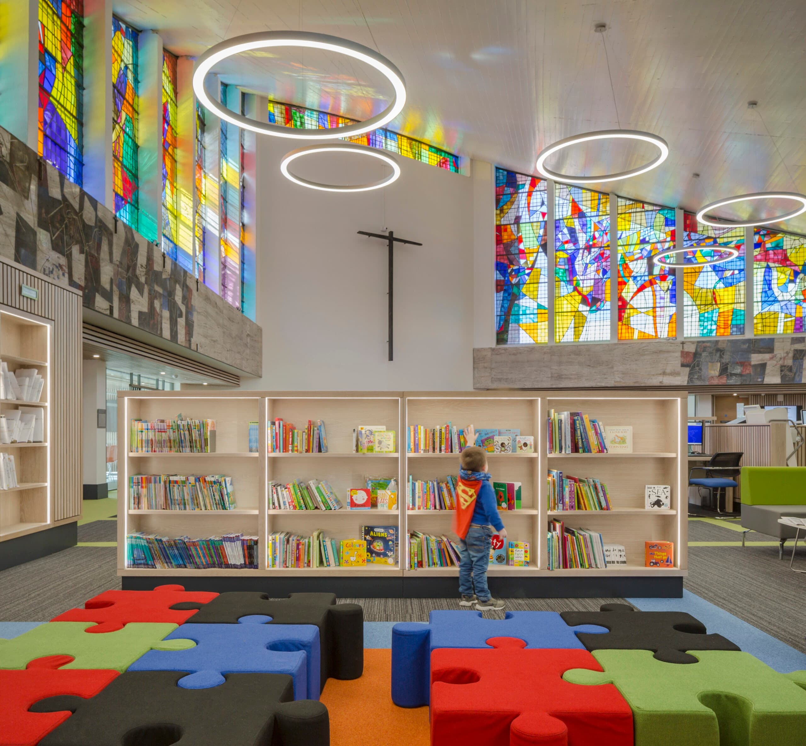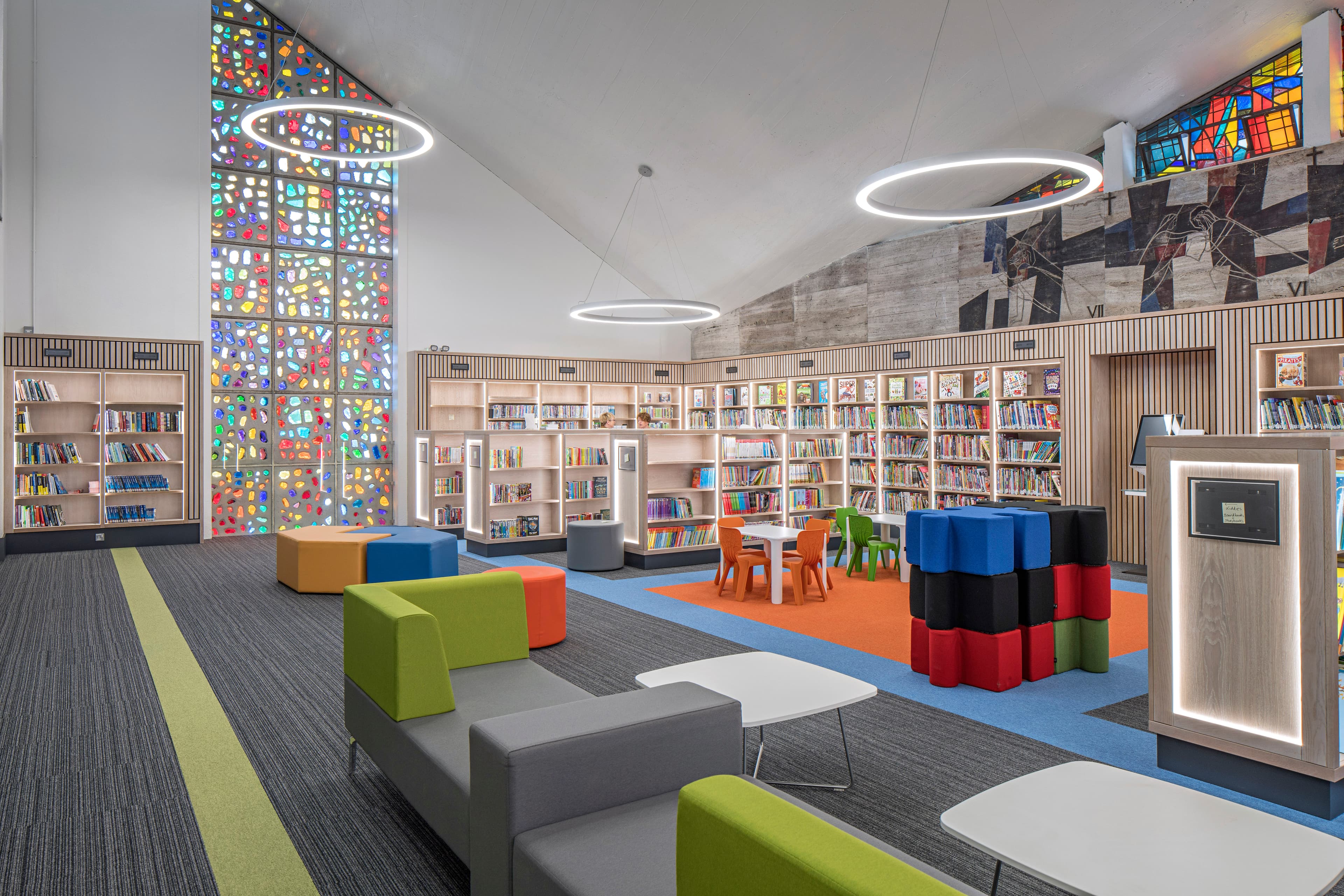 A key challenge was to retain the unique architectural characteristics of the church whilst providing a multifunctional and comfortable library space which would be a joy to visitors and staff alike.