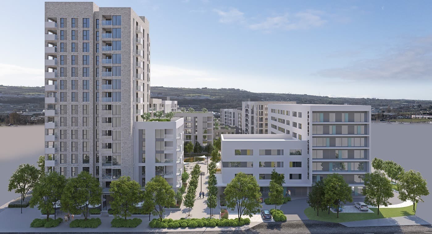 Addressing the challenges of the project requires an holistic and multidisciplinary approach involving urban planners, architects, engineers, environmental experts, and community stakeholders. A 15-storey landmark building was provided to designate the location on arrival from the city and to act as a new architectural idiom for the urban regeneration of the Kinsale & Tramore Road areas. A strong urban edge is provided on both roads with live frontages at ground floor and multiple pedestrian and cycle pathways. A new town square is provided for the local area, surrounded by a primary care centre, restaurant, café, shops and gym. The residences are a mix of apartments, double dwellings, townhouse apartments, and age-friendly deck access units. These are arranged in a hierarchy of different character areas, ranging from public town square, through to residential courtyards to meadow park.
