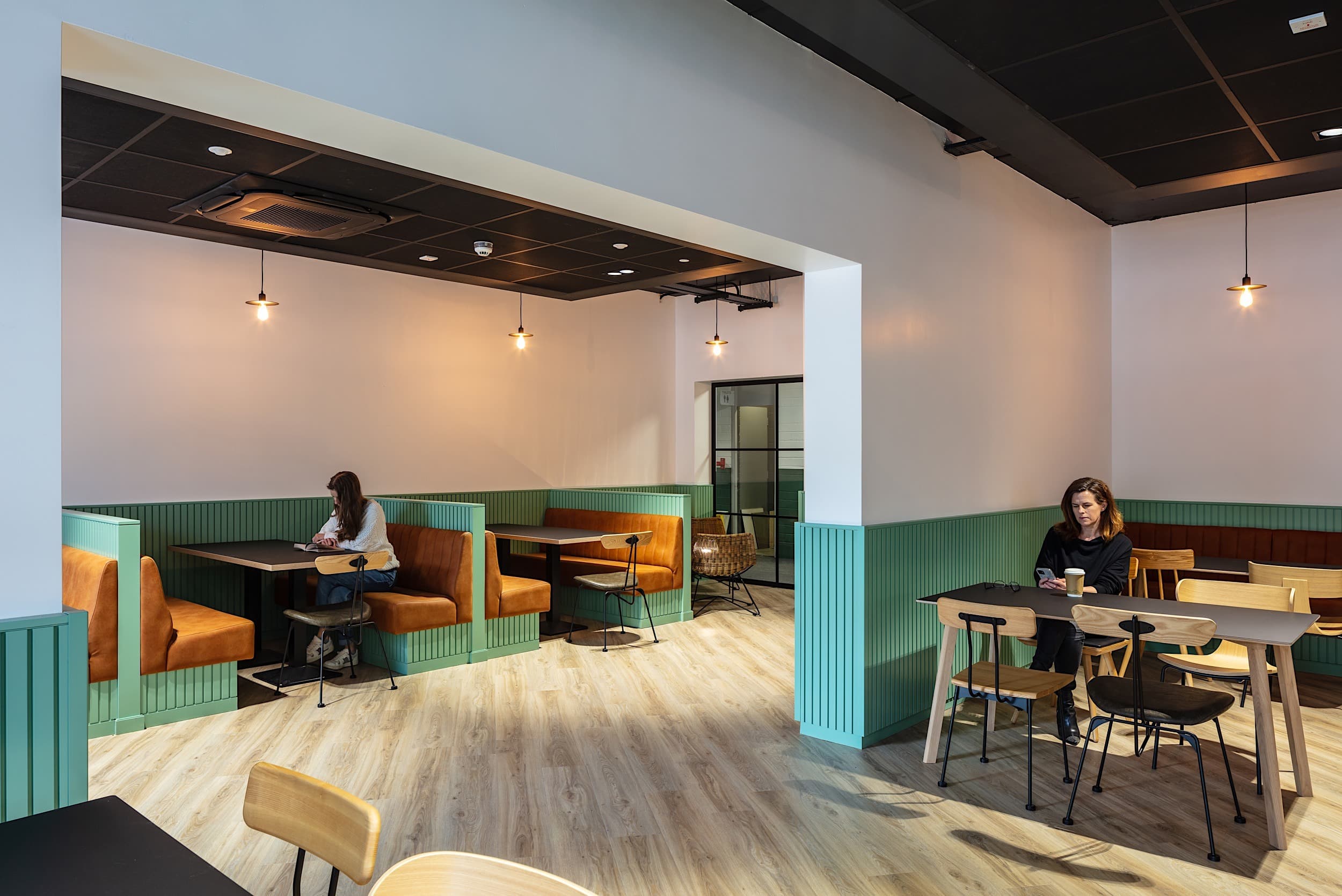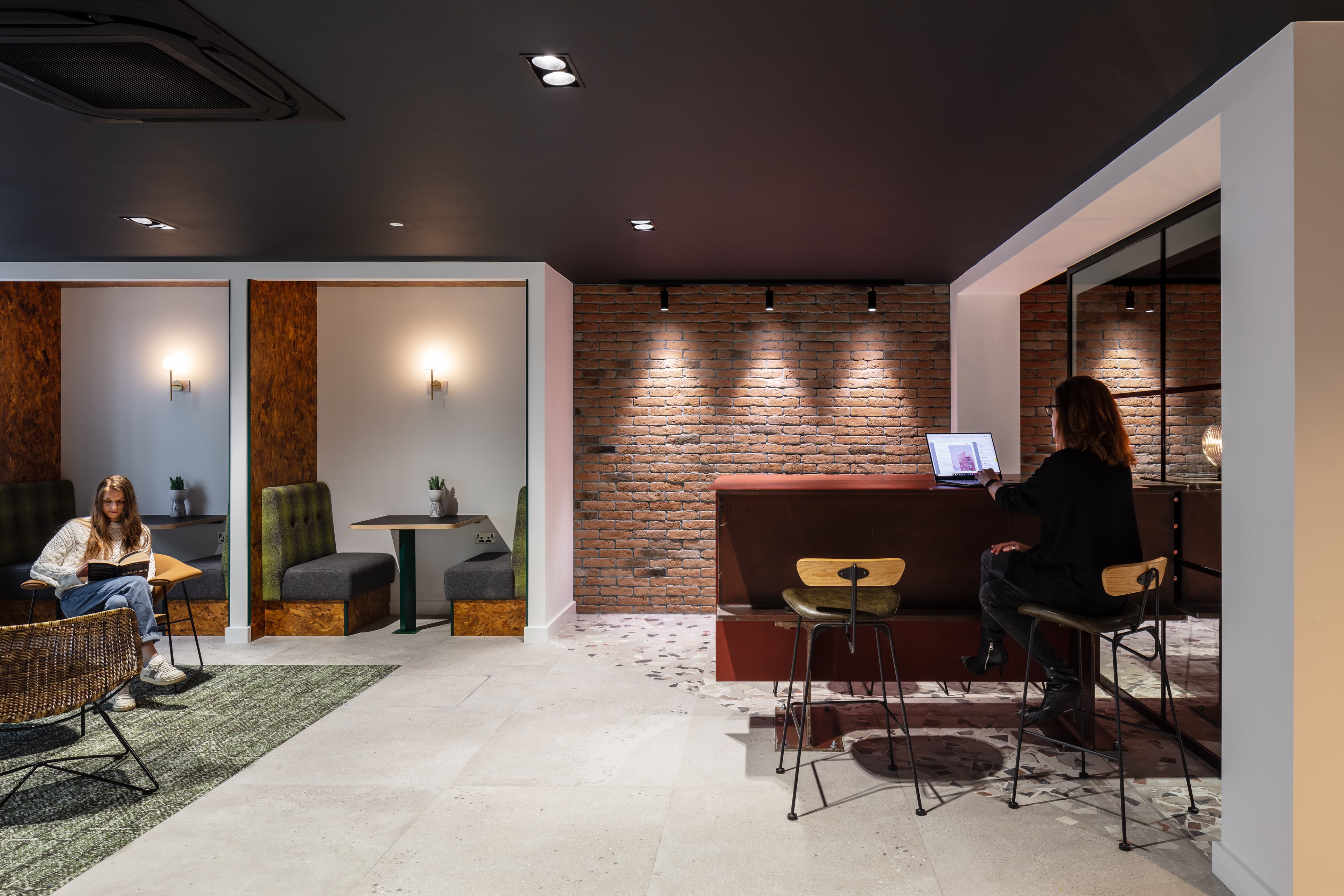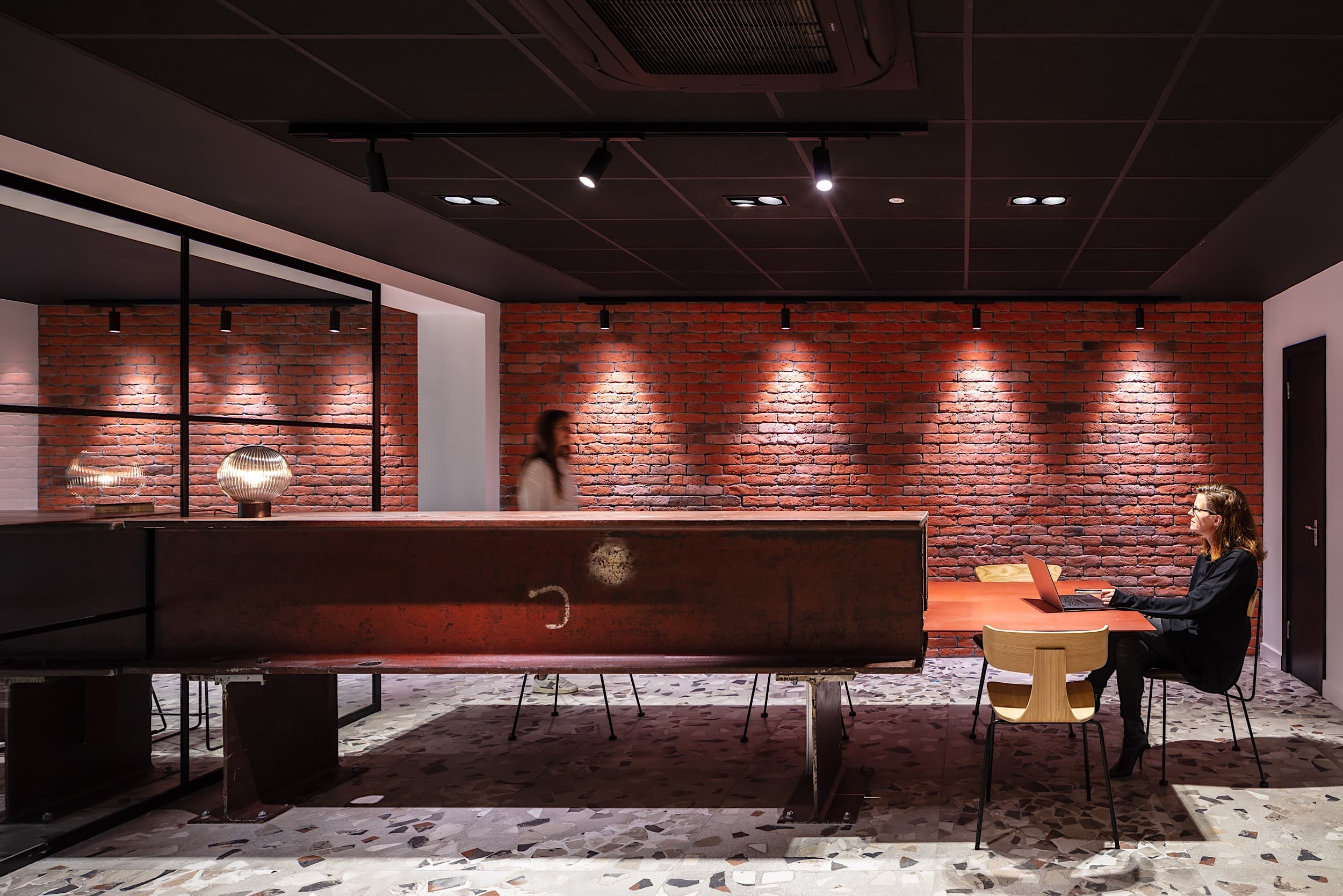Drawing inspiration from the site's heritage, Reddy A+U crafted a vibrant design that blends modern steel and glass facades with the industrial context. Salvaged steel from the existing roof structure was repurposed for the reception desk and hot desk areas. The design intentionally exposed new structural elements, such as the spliced column sections on the upper floor. These exposed steel columns are echoed in the fourth-floor corridor, creating a rhythmic pattern that serves as a backdrop for communal breakout and coffee points.