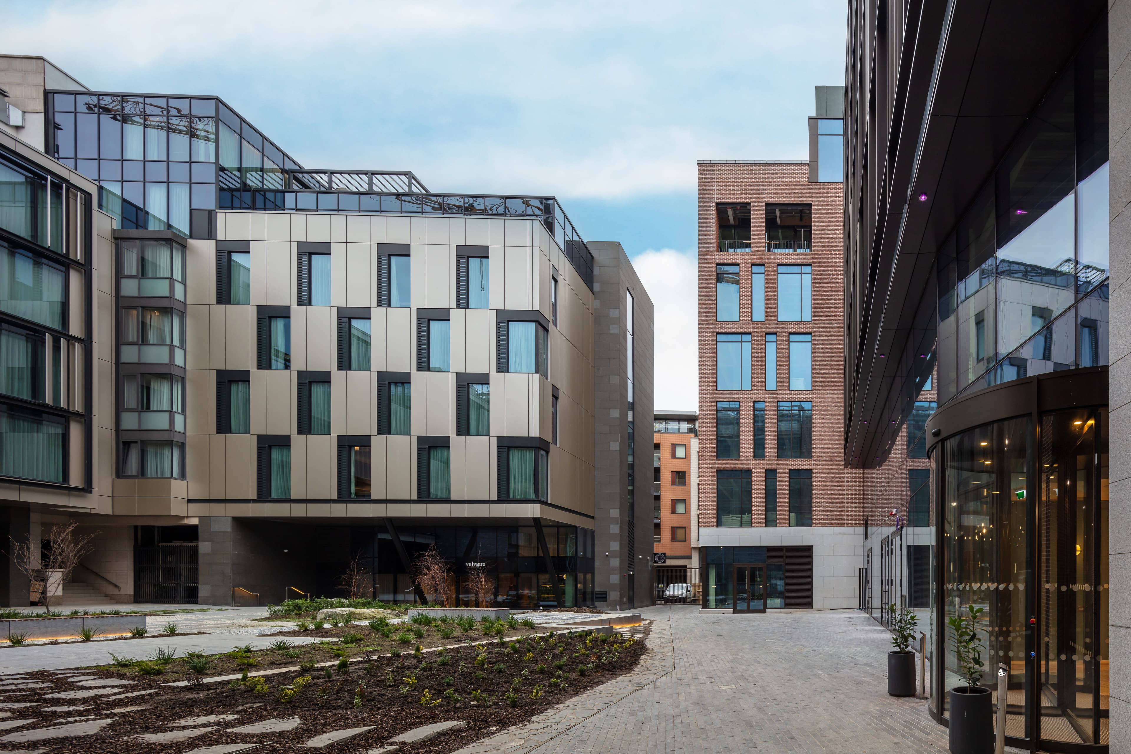 Radisson hotel and the extension sits within the existing city block, redefining the scale of its built environment, whilst creating a new desire line through the new square from Dublin Castle to the Liberties. The massing of the building fits in with the existing streetscape and brick textures of Dublin Castle while establishing a hierarchy of façade treatment through the depth of façade elements.