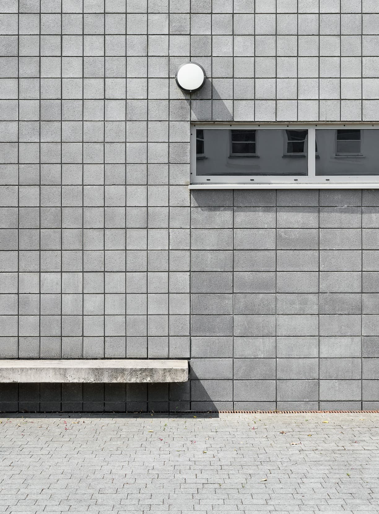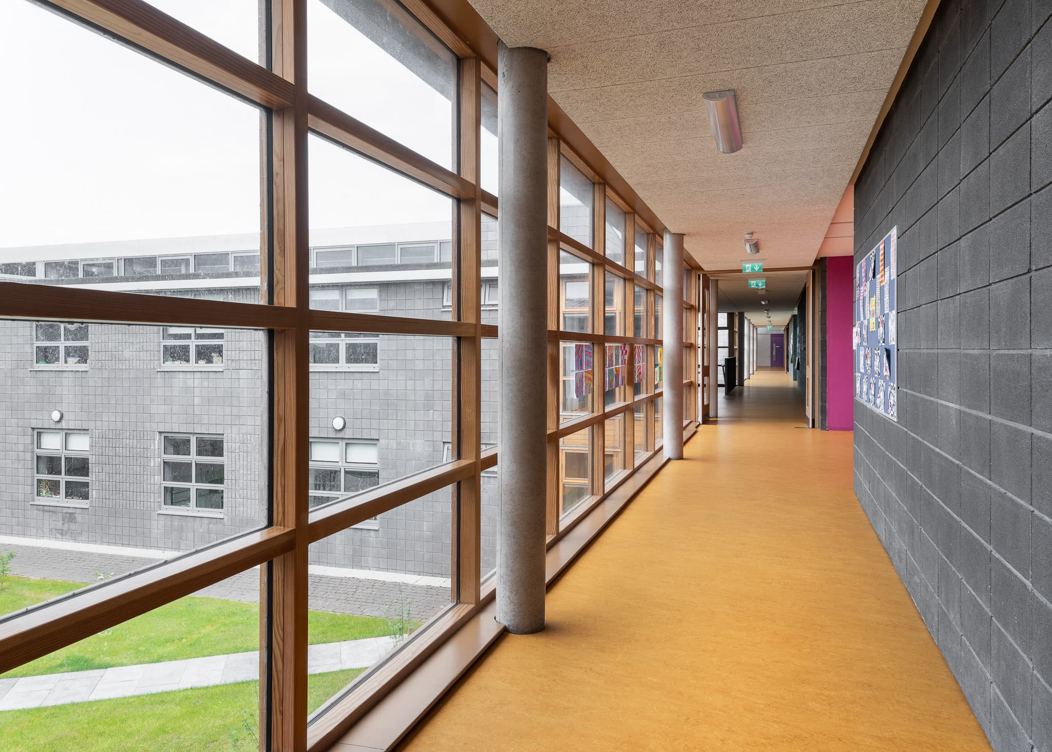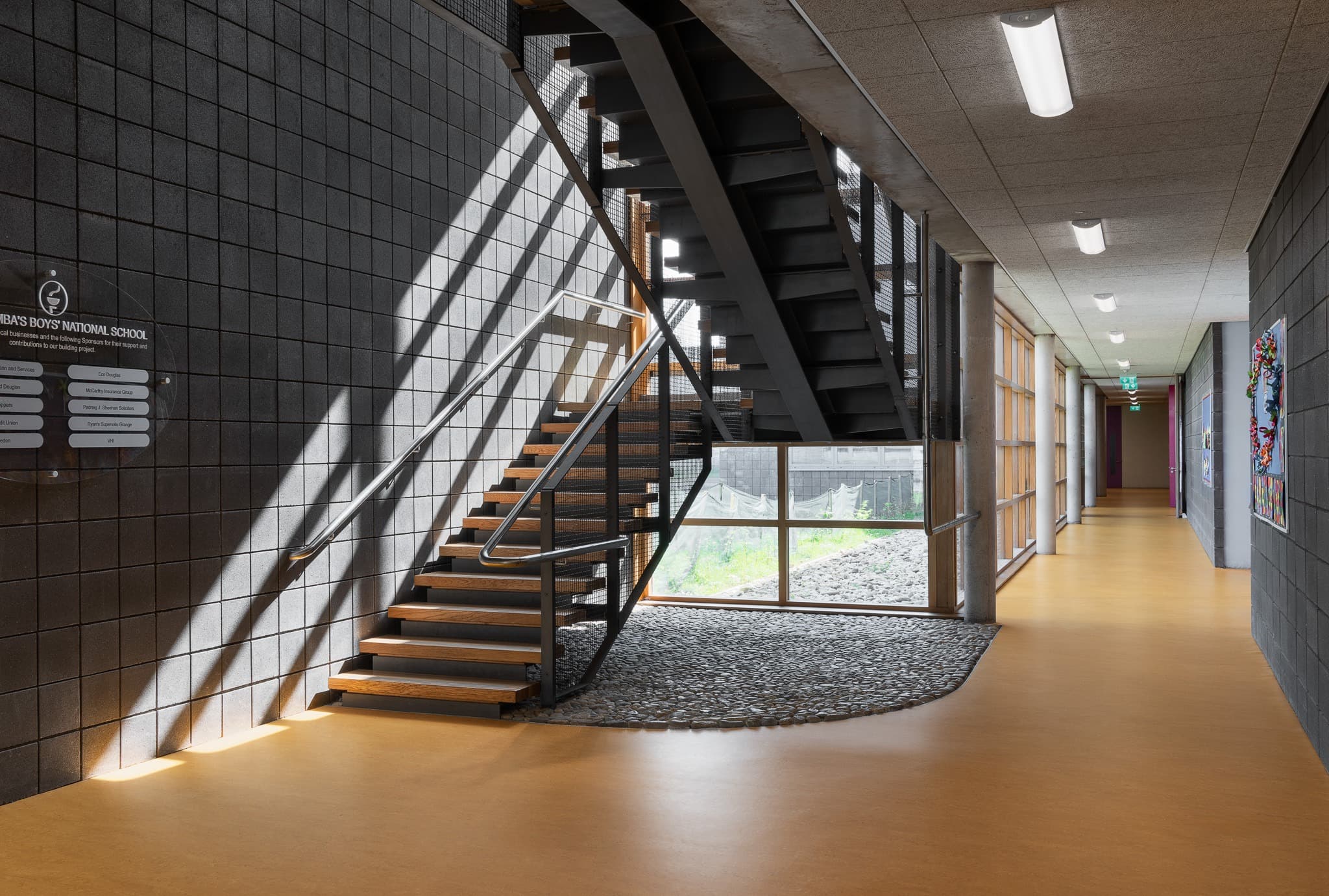 The building is of masonry construction and is finished in a distinctive charcoal concrete block. This is complimented with milled aluminium roofs, all set in lush green surroundings. The internal spine corridor is like a street with the same charcoal blockwork lining the hallways on one side and glazed cloisters on the other side which open to the courtyards.