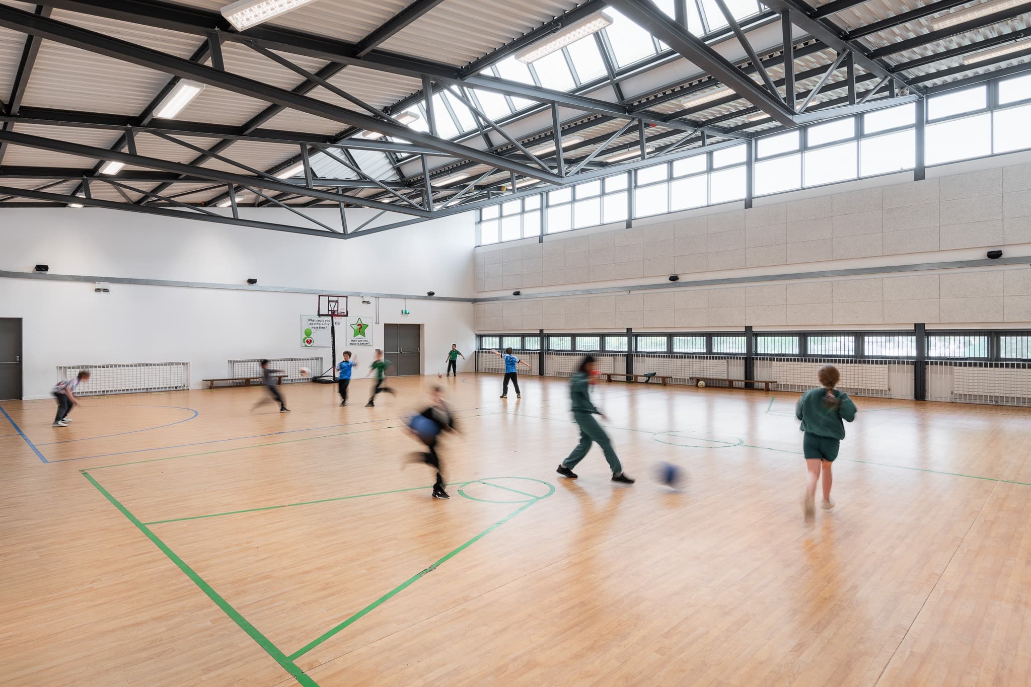 The project was multi-phased which included the provision of temporary accommodation to facilitate the demolition of the exiting school building. The new build is part single-storey and part two-storey. The central two-storey footprint has all classrooms facing south or east. On opposing ends single-storey footprints of a SEN unit front the public street to the east and a lofty GP room fronts the ballcourts to the west.