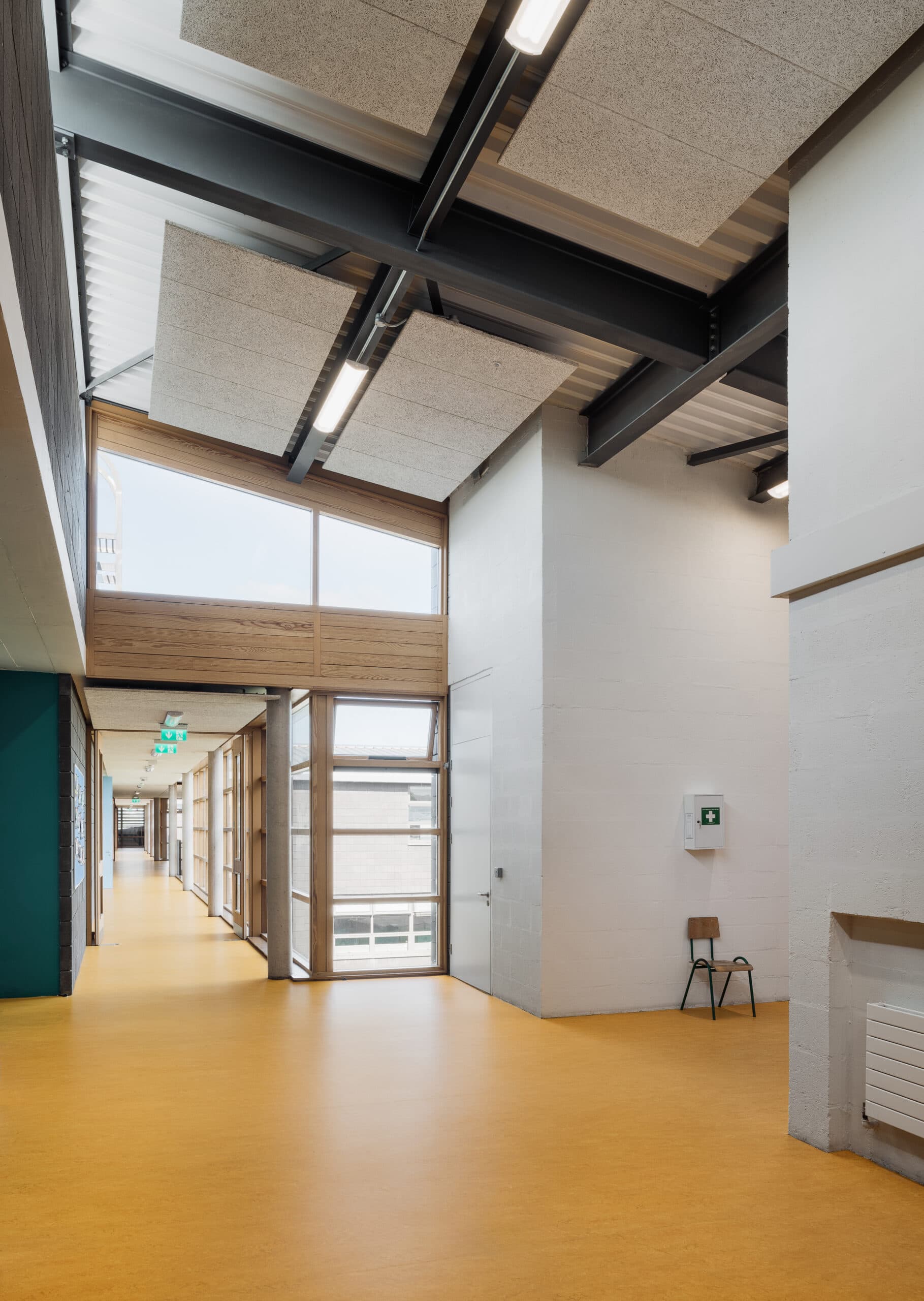 The entrance thresholds of each classroom are signified with a distinctive burst of colour. Ancillary accommodations are assigned neutral door colours. Staff rooms are identifiable with glass blockwork. Steel stairs, timber curtain walling and wood wool ceilings add to the richness of texture and colour of the common areas. In contrast the teaching spaces are painted flush pointed blockwork. The windows to all teaching spaces are metal. The classroom furniture matches the burst of colour at the doorways which individualises the parts within the whole.