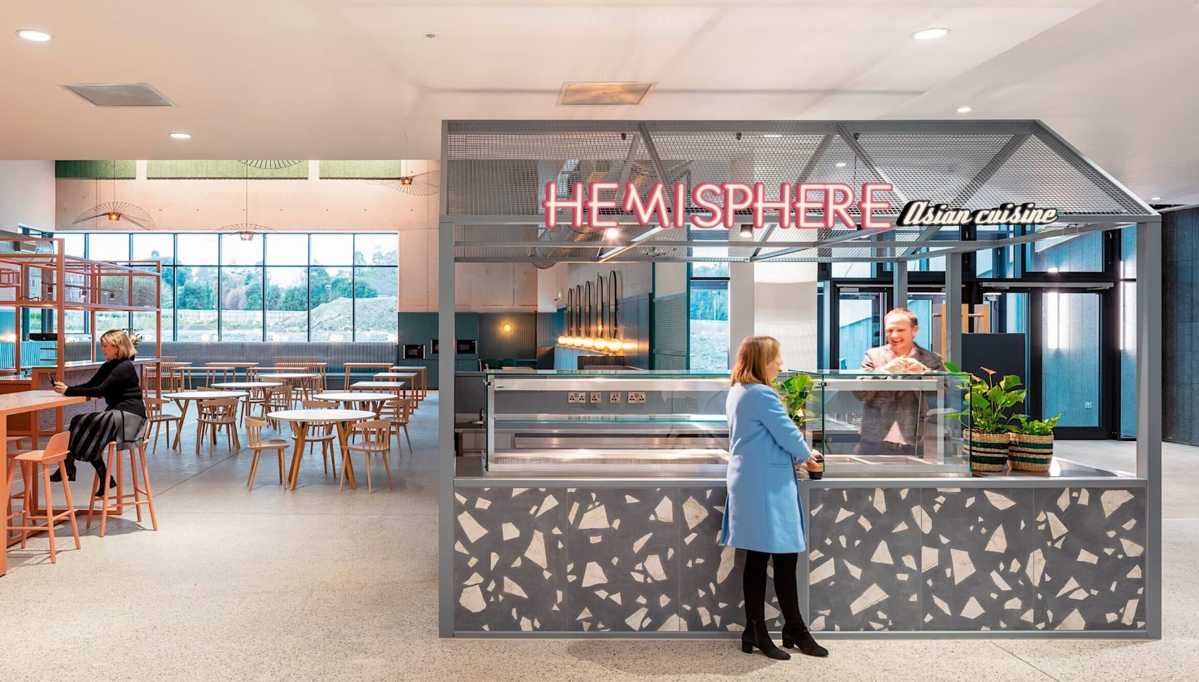 Open to the public and students alike, the Food Hall fosters a sense of community and integration with the surrounding area. Along with expansive seating and study areas considered in the wider plan, it provides a much-needed respite from the everyday stresses of student life.